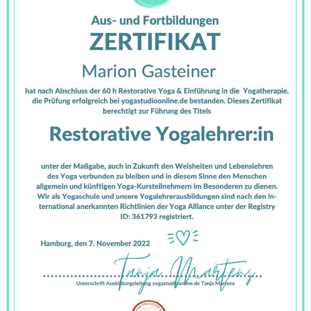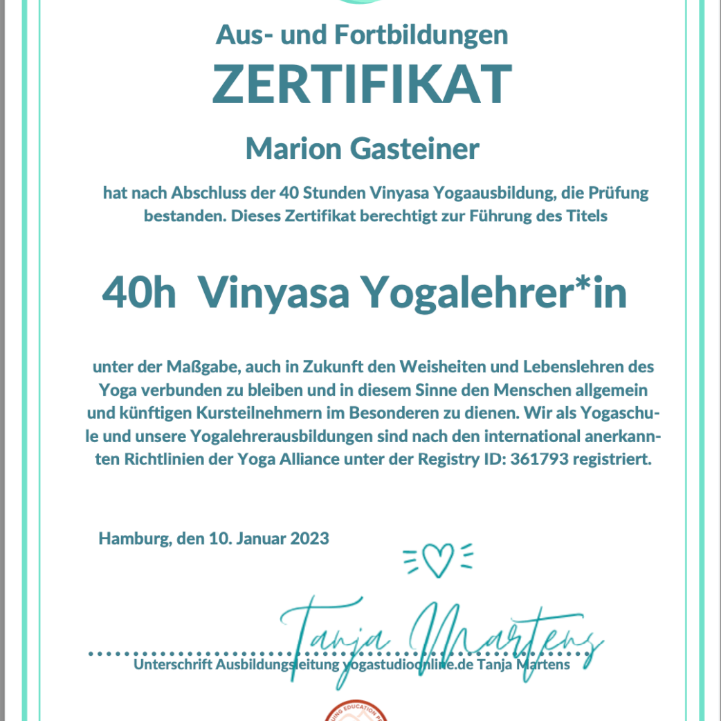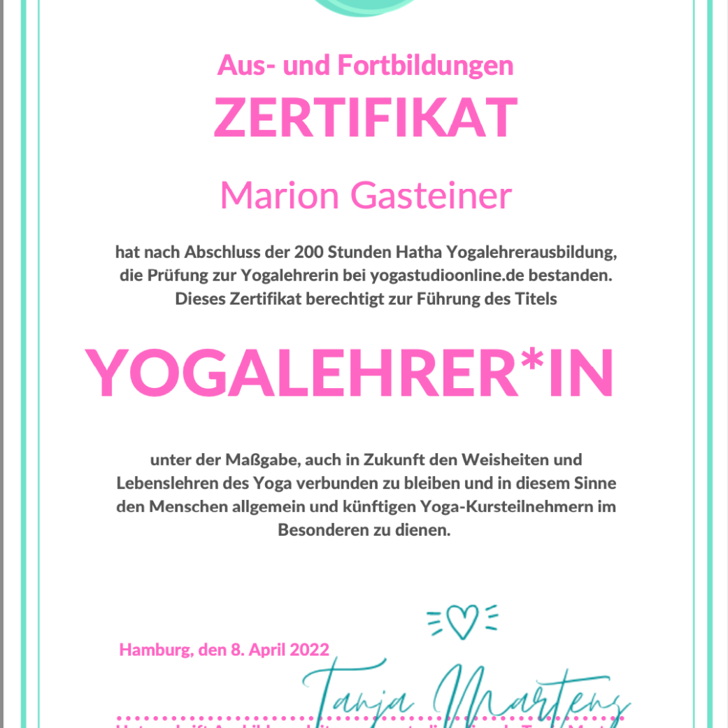Generell denke ich, dass die Chemie zwischen Klienten und Yoga-Lehrerin/Energetikerin passen muss, daß man sich wohl fühlen soll bei der Einheit. Aber selbstverständlich ist es auch wichtig, daß man sicher sein kann, daß die Yoga-Lehrerin/Energetikerin weiss, wovon sie spricht, wie sie arbeitet und unterrichtet. Daher zeige ich Dir hier, welche Ausbildungen ich bereits absolviert habe.
